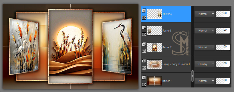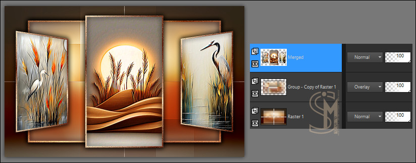 25 - Feche a visibilidade das layers Raster 1 e Group - Copy of Raster 1. Layers > Merge > Merge Visibile. Abra a visibilidade das layers Raster 1 e Group - Copy of Raster 1.
