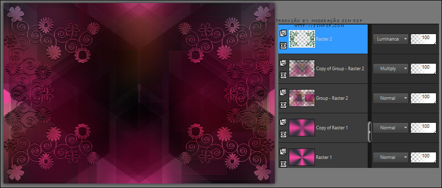 15- Layers > Duplicate. Image > Mirror > Mirror Horizontal. Layers > Merge > Merge Down. Mova levemente para baixo... Layers > Properties > General > Blend Mode: Luminance - Opacity: 77% Effects > Edge Effects > Enhance More.