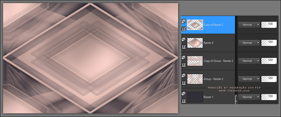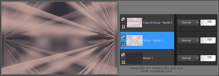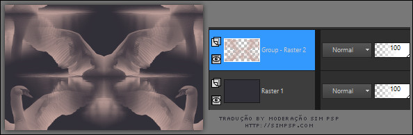 Layers > Duplicate. Image > Mirror > Mirror Horizontal. Layers > Properties > General > Opacity: 50% Layers > Merge > Merge Down. Ativar a layer Group - Raster 2. Adjust > Blur > Gaussian Blur: 25
