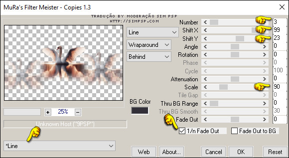 Beautiful_Swan74G_misted_Silvie_16.06.2024. Edit > Paste as New Layer. Layers > Arrange > Bring to Top. Image> Resize: 50% - resize all layers não marcado. Effects > Plugins > Mura's Meister > Copies: