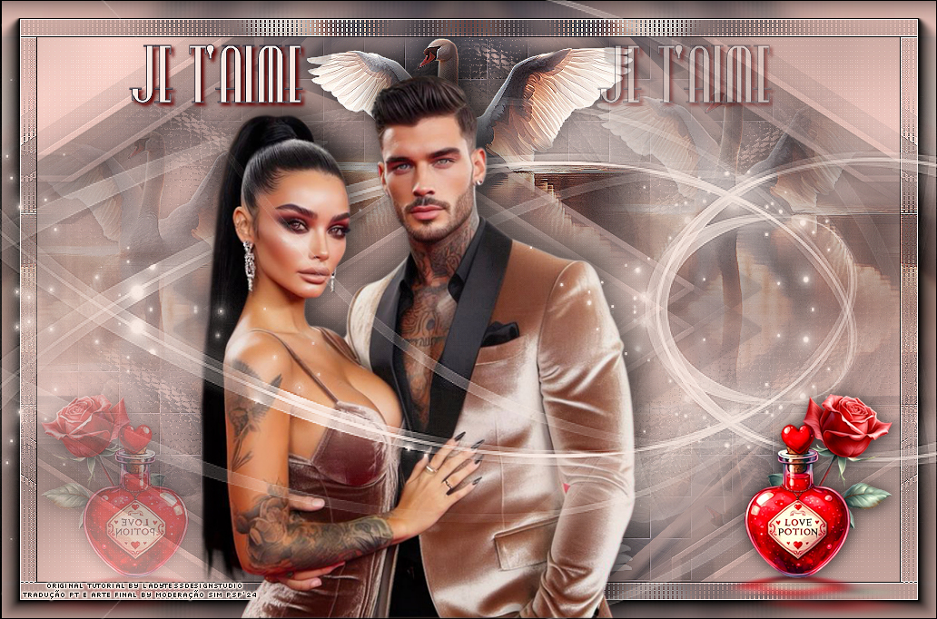27- Ative a cópia do arquivo LTDStudio_Je t'aime_Texto. Edit > Copy. Edit > Paste as New Layer. Posicionar conforme sua preferência ou como no exemplo da tag original.