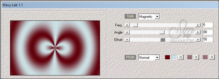 02 - Abra uma imagem transparente de 900x550px. Pintar a transparência com o gradiente Radial. Effects > Plugins > Mehdi > Wavy Lab 1.1: Coloque na ordem a cor do Background, depois a cor do Foreground e mantenha as duas últimas cores criadas pelo filtro.