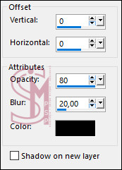 Deko-2. Edit > Paste as New Layer. Ativar a ferramenta Pick e configure: Position X: 160,00 - Position Y: 0,00 Pressione a tecla "M" para desativar a "Ferramenta Pick". Effects > 3D Effects > Drop Shadow: color: #000000 (preto)