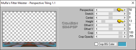 7 - Ativar a Layer Raster 1. Layers > Duplicate. Layers > Arrange > Bring To Top. Effects > Plugins > MuR'as Meister > Perspective Tiling.