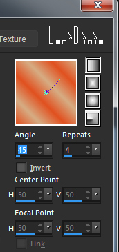 1- Abra o material no psp, copie e feche o original. Escolha duas cores para trabalhar. 2- Prepara um gradiente Linear: Angle: 45 > Repeats: 4 > Invert: desmarcado