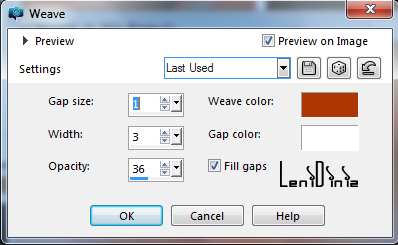 5- Layers > Duplicate. Fechar a visibilidade da layer Copy of Raster 1. Ativar a layer Raster 1. 6- Effects > Texture Effects > Weave: Weave color: #e15020 (foreground) - Gap color: #ffffff branco