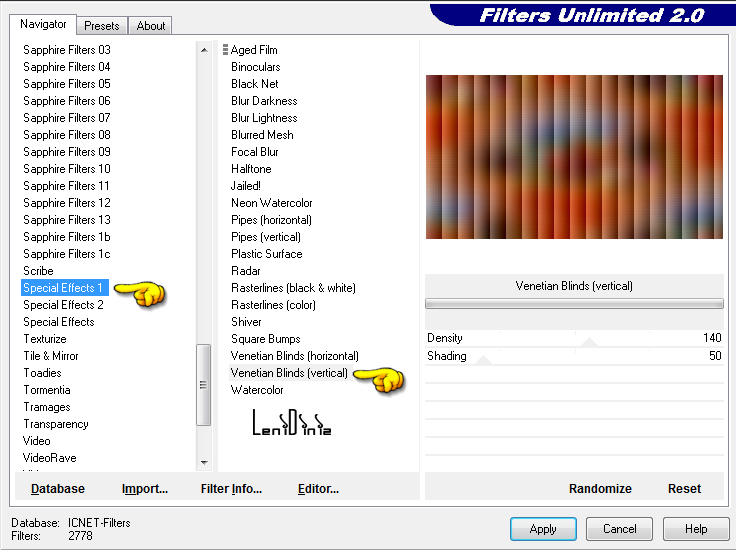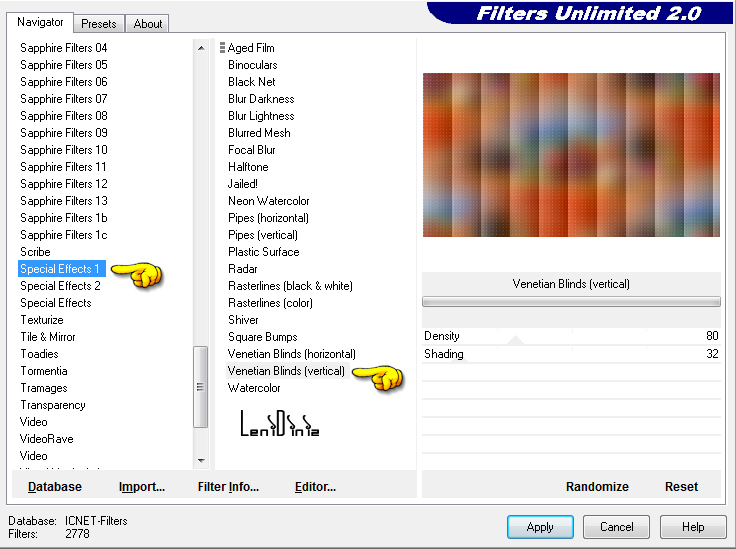 7- Effects > Plugins > Filter Unlimited > Special Effects 1 > Venetian Blinds (vertical).