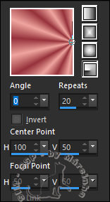 - 02- Abra o alpha_channel_flowers.pspimage Pinte com o gradiente formado pelas cores escolhidas: Radial - Angle: 0 - Repeats: 20 - Inverte desmarcado Center Point: H-100 - V-50
