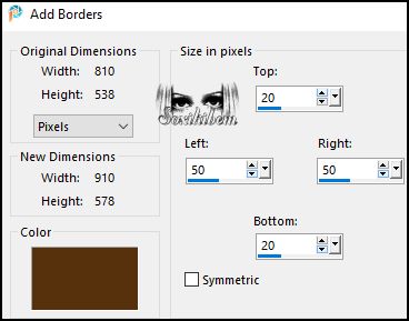 23 - Selections > Select All. Image > Add Borders: Symmetric desmarcado. Top e Bottom 20, Left e Right 50, com qualquer cor.
