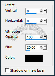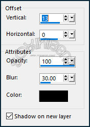 13 - Ativar a Layer Raster 2. Effects > 3D Effects > Drop Shadow: Shadown on new layer desmarcado Selections > Select None.