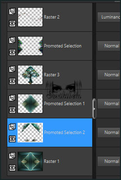 15 - Selection > Promote Selection to Layer. Ativar a Layer Raster 3. Edit > Cut ou aperte a tecla Delete. Selections > Select None. Ativar a Promoted Selection 2. Layers > Arrange > Move Down 2 vezes.