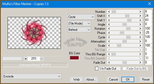 18- Edit > Copy no Misted de Flor. Edit > Paste as New Layer. Se necessário, ajustar no centro do círculo com a ferramenta Pick Tool. Layers > Merge > Merge Down. Image > Resize > 50% > All Layers desmarcado 19- Effects > Plugin > Mura's Meister > Copies: