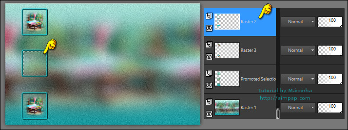 18 - Ativar a layer Raster 2. Com a ferramenta Magic Wand > Tolerance e Feather em 0, clique dentro do quadro do meio para selecionar: