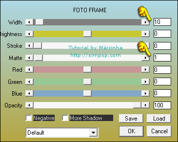 40 - Selections > Invert. Effects > 3D Effects > Drop Shadow: 0 / 0 / 100 / 35, color #000000 (Preto) Selections > Invert. Effects > Plugins > AAA Frames > Foto Frame: