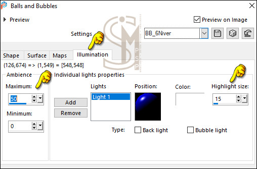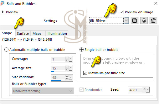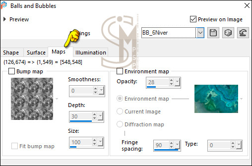 17 - Effects > Artistic Effects > Balls and Bubbles > Preset BB_6Niver: (Na aba Surface, em Material, colocar o Gradiente de Uso).