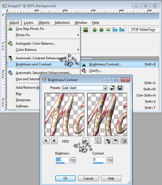 15- Na layer da Mae2 aplique o efeito Adjust > Brightness and Constast > Brightness/Contrast nas seguintes configurações: