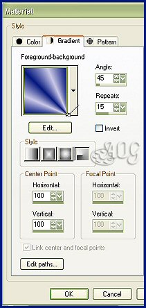1- Escolher 2 cores do tube. Eu escolhi para o foreground #05187F e para o background #CCC9E8. Formar um gradiente como no print: