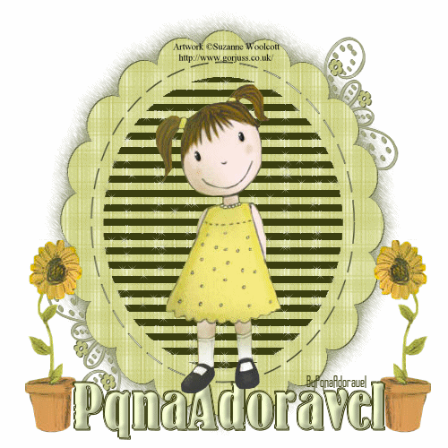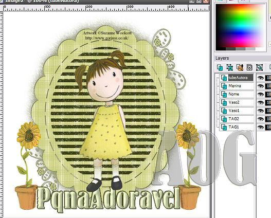 16- Selections > Modify > Expand > 1 17- Drop Shadow por duas vezes como no item 5. Select None. Renomei essa layer para NOME. 18- Aplique os tubes dos vasinhos de flor renomeando para vasinho 1 e 2. Em seguida aplique o tube da meninha e renomeie a layer para menina. Coloque a layer do nome para depois da layer do tube da menina NOTA: Para alguns tubes, os autores pedem que deêm créditos a eles. Os tubes Gorjuss é um deles. Assim segue junto ao material o tube de créditos da autora. Apliquei o mesmo no alto ta tag. Veja como ficou a colocação das imagens e das Layers: