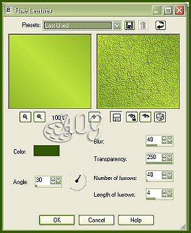 8- Adicionar uma nova layer. Selections > Select All Pintar com a cor escura. Selections > Modify > Contract > 1 Deletar 9- Pintar com o gradiente, retornando o angle para 45 Effects > Texture Effects > Fine Leather, conforme print abaixo:
