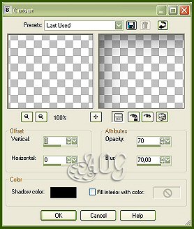 5- Ativar a layer Efeito 1 Pintar a parte selecionada com o gradiente em uso, somente trocando o angle para 0 (zero). Effects > 3D > Drop Shadow > 5/5/90/35 color preto Adjust > Sharpness > Sharpen Fechar a visibilidade desta layer.