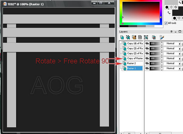 4- Pinte essa seleção com a cor do Background. Aplique nessa layer o efeito do Drop Shadow na configuração 1/1/100/5 > Color: black. Faça 4 cópias dessa Layer, obtendo assim 5 Layers. 5- Arrume a posição dessas Layers seguindo o print sendo que em duas Layers vc precisará dar Rotate > Free Rotate > 90 e ajeitar nas laterais da imagem: