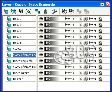 23- No PSP Fechar a visibilidade de todas as layers. Abrir a visibilidade das layers Raster 1, Braço Direito, Braço Esquerdo, Corpo e Bola 1 Ativar a layer Raster 1 Selections > Select All Edit > Copy Merged