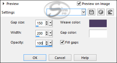 08- Effects > Texture Effects > Weave. Weave color: color 1 #4c3d64 Gap Color: #FFFFFF (white)
