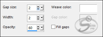 42- Com a Ferramenta Magic Wand Tool > Tolerance e Feather: 0, selecione essa borda. Effects > Texture Effects > Weave: Weave color: #FFFFFF
