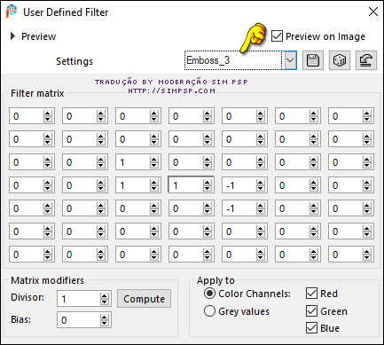 10- Layers > Duplicate. Layers > Merge > Merge Down. Effects > User Defined Filter: Emboss_3