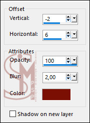 7 - Selections > Invert. Effects > 3D Effects > Drop Shadow: Color > Foreground: #7b1105