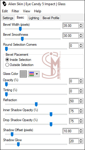 14 - Layers > New Raster Layer. Ative a cópia do mist coly . Edit > Copy. Volte para a imagem que estamos trabalhando... Edit > Paste Into Selection. Effects > Plugins > Alien Skin Eye Candy 5 Impact > Glass: