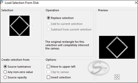 03 - Layers > New Raster Layer. Selections > Load/Save Selections > Load Selection From Disk: SELECTION 1 195