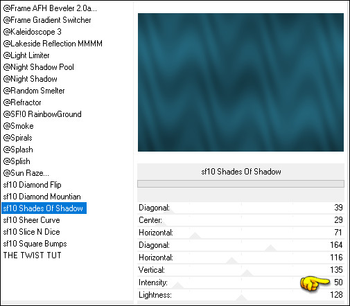 Pintar com a cor do Foreground: #194756 Layers > Arrange > Move Down. Effects > Plugin > Filter Unlimited 2.0 > Background Designers IV > sf10 Shades Of Shadow: