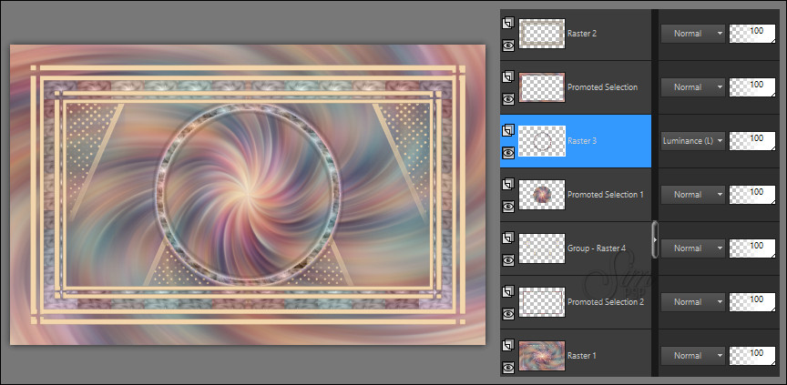 Layer > Arrange > Move UP por 4 vezes. (Ficará acima da layer Raster 3) Selections > Select None. Layers > Merge > Merge Down. Layers > Properties > General > Blend Mode: Luminance (L) ou outro de sua escolha