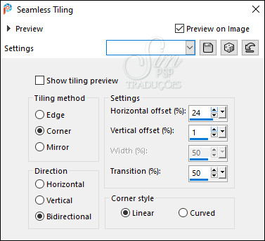 14 - Selections > Select All. Image > Add Borders > Symmetric: 20px - com qualquer cor. Effects > Image Effects > Seamless Tiling: