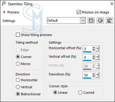 08 - Selections > Select All Image > Add Borders > Symmetric: 60px - Color: Foreground Effects > Image Effects > Seamless Tiling: Default