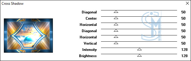 Adjust > Blur > Gaussian Blur: 15 Pintar a seleção com a cor do Foreground: #1d4d72 Effects > Plugins > Graphic Plus > Cross Shadow: Default