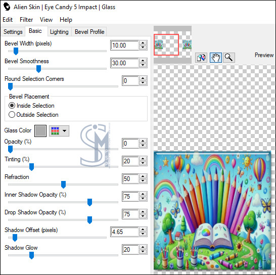 Alien Skin > Eyes Candy 5 Impact > Glass: Em Settings escolha o efeito Glass ETAPE 4 224 ou Configure o Basic como indicado:
