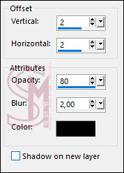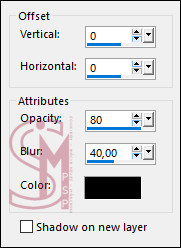 Deko-2. Edit > Paste as New Layer. Ativar a ferramenta Pick e configure: Position X: 160,00 - Position Y: 0,00 Pressione a tecla "M" para desativar a "Ferramenta Pick". Effects > 3D Effects > Drop Shadow: color: #000000 (preto)