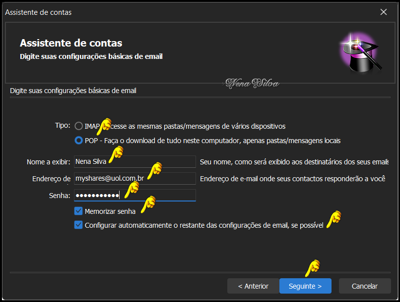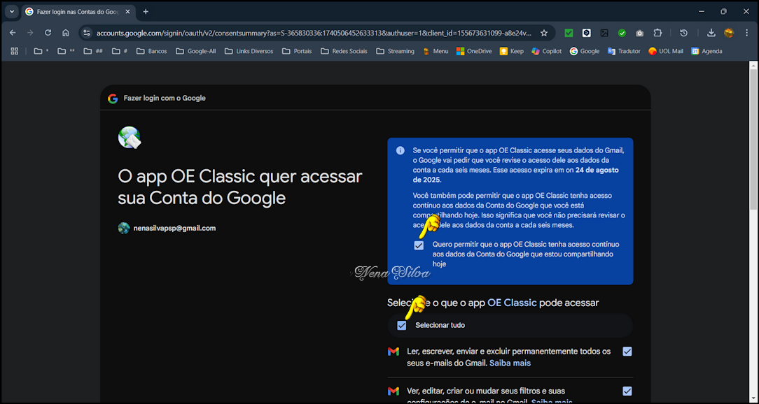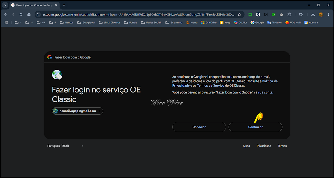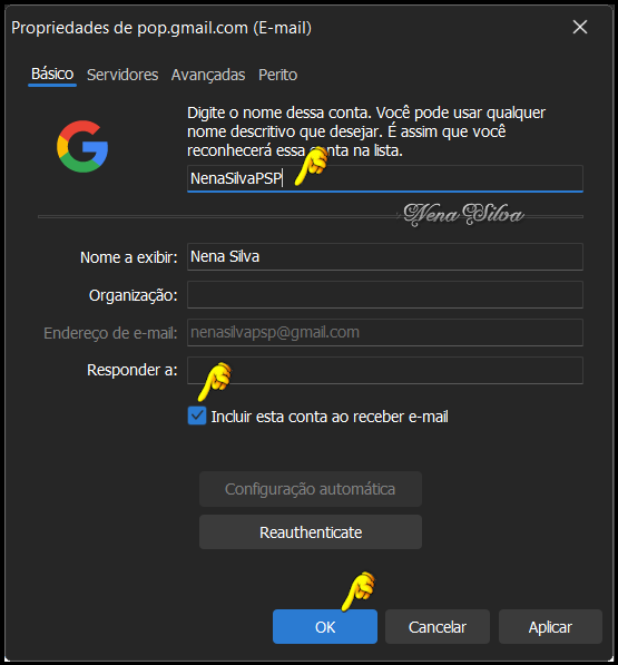 dispositivos. Eu uso somente POP. Clique em Seguinte. Vai se abrir uma janela de seu navegador padrão, pedindo para você fazer login. Digite o seu e-mail do GMail e clique em Próxima. Digite sua senha e clique em Próxima: Google vai solicitar a Verificação em duas etapas. Você receberá imediatamente, em seu celular cadastrado em sua conta do Google, um SMS contendo um código, digite esse código no campo indicado. Em seguida, se abrirá esta janela, clique em Continuar. Nesta janela, configure conforme está indicado. Esta é a continuação da mesma janela, role a tela para baixo e clique em Continuar. Se abrirá automaticamente o site do OE Classic, confirmando o acesso. Feche essa janela e volte ao OE Classic. Clique em Concluir. Voltará a aparecer a Tela de configuração de contas, clique em Propriedades. Renomeie no primeiro campo, dando um nome à conta para melhor identificação. Se você quiser que essa conta seja incluída sempre que você receber seus e-mails, deixe clicado onde está indicado. Se não quiser, é só desclicar. Em seguida, clique em OK. Clicando em OK, volta a janela de configuração de contas. Agora, vamos adicionar uma conta de qualquer outro provedor que não seja GMail. Como exemplo, usei uma conta do Uol. Clique em Adicionar. No Assistente de contas, selecione Conta de e-mail e clique em Seguinte: Essa tela é auto explicativa. Selecione POP (ou IMAP, se preferir), seu nome de Exibição, seu endereço de e-mail, sua senha, deixe clicadas as duas opções conforme print e clique em Seguinte. Estando tudo certo, sua nova conta de e-mail está criada. Clique em Concluir. Voltará a janela de Contas, selecione a conta e clique em Propriedades. Renomeie como fez anteriormente, para melhor identificação da conta. Clique em Aplicar e em seguida em OK. Estando tudo OK, clique em Fechar. Se você tem a versão PRO, poderá configurar quantas contas quiser, é só seguir os mesmos procedimentos. Na versão free, você pode configurar apenas duas contas. Em seguida, vamos fazer um teste para verificar se está tudo OK. Enviei um e-mail da conta GMail para a conta Uol.