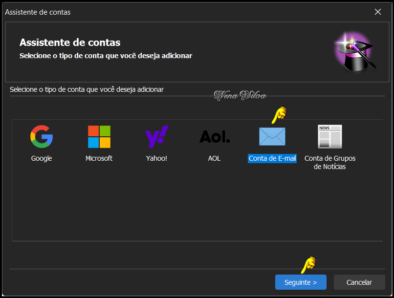 Instalação Após baixar o Programa, localize a pasta onde salvou o executável: Vamos dar início à instalação. Clique com o botão direito do mouse sobre o executável, e selecione a opção Executar como Administrador. Logo que a instalação terminar, você verá o ícone do Programa em sua área de trabalho. Clique 2 vezes sobre ele. O Programa pedirá para você selecionar o idioma, selecione e clique em OK. OE Classic abrirá, com suas configurações default. O primeiro passo é configurar suas contas de e-mail. Clique em Ferramentas, depois em Contas: Clicando em Contas, vai se abrir esta janela de configuração: Selecione E-mail, e clique em Adicionar O Assistente de contas será aberto, você pode escolher a opção que quiser. Em primeiro lugar, vamos configurar uma conta do GMail. Selecione Google e clique em Seguinte. Você pode escolher o tipo como IMAP ou POP. Basicamente, as diferenças entre IMAP e POP são as seguintes: POP: Ele baixa os e-mails do servidor para o dispositivo local e,