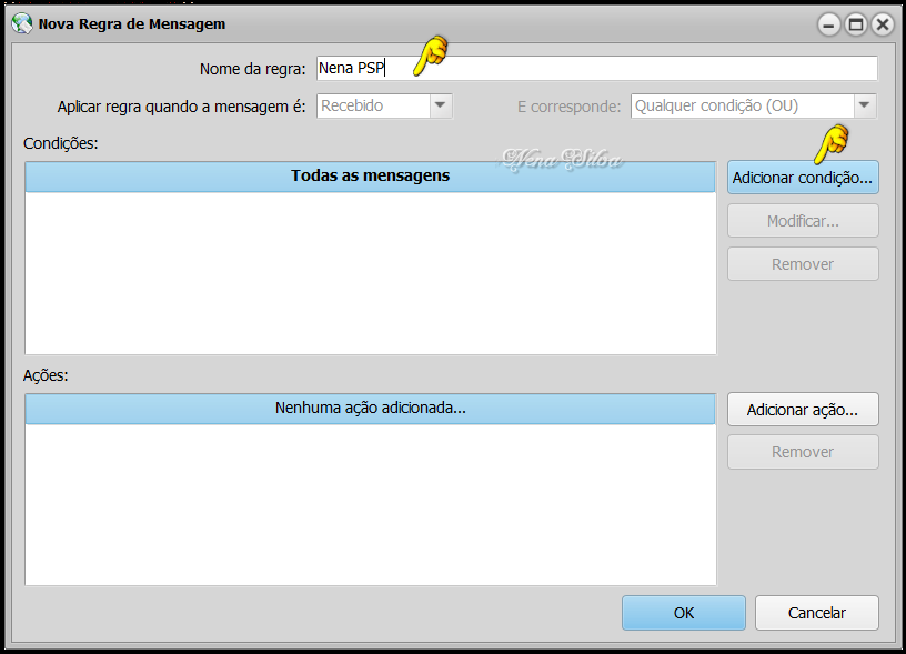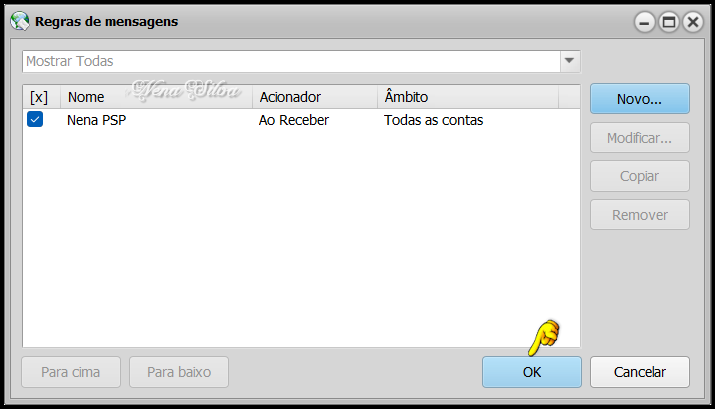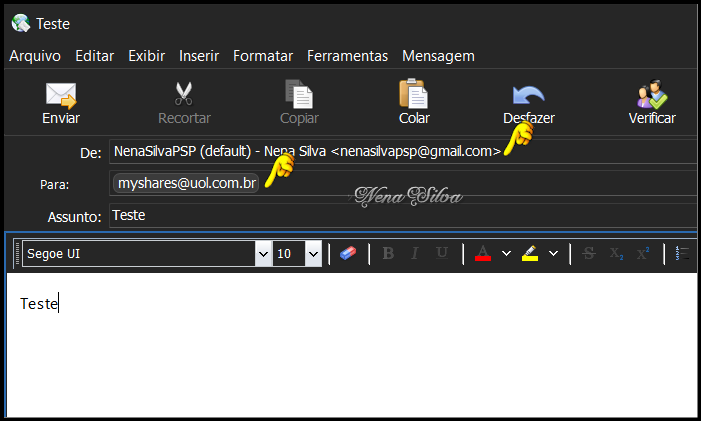 Fiz outro teste usando a conta Uol para enviar e a conta GMail para receber, funcionou corretamente. Se você tem seu PC configurado para usar o Tema Escuro, por padrão o OE Classic também será escuro. Mas, se vc não gostar, pode mudar indo em Exibir > Themes, existem muitas opções de temas para escolher: Este é o tema que escolhi, e que pode ser mudado à vontade, é só clicar na opção desejada. Nas próximas versões do Programa, será incluida a Opção None, se você não quiser usar nenhum tema. Neste ponto, se você tem a versão PRO, é hora de ativar o Programa. Para ativar o OE Classic, vá no menu Ajuda e clique em Ativar..., vai aparecer esta janela. Digite seu nome de usuário corretamente e digite a chave da licença: Estando tudo OK, aparece esta janelinha. Se não aparecer, verifique se digitou corretamente seu nome de usuário e senha. Vamos configurar o OE Classic. Clique em Ferramentas > Opções... Clique em Default para tornar o OE Classic seu programa padrão: Nas Configurações, as telas a seguir demonstram a minha maneira de trabalhar com o programa. Você escolhe outras maneiras se quiser, é só clicar nas setinhas ao lado de cada opção e escolher. Na aba Layout, as configurações abaixo são as que uso, porque não gosto de ter painel de pré-visualização, prefiro abrir a mensagem inteira. Você configura como quiser. Na aba Avançadas, recomendo configurar como está na tela abaixo. O motor do navegador deve ser IE7 (legacy), para que os e-mails formatados funcionem a contento. Se você não usa e-mails formatados, clique na setinha à direita e escolha a opção recomendada, Edge Chromium. O OE Classic está pronto para uso. Eu demonstrei as principais configurações, mas existem muitas, muitas outras que você pode fazer para personalizar o programa. Por exemplo, clicando com o botão direito em um local vazio da Barra de Ferramentas, você pode personalizar a seu gosto, adicionando ou removendo os botões disponíveis: E se você clicar com o botão direito na barra da janela de e-mails e em Colunas, pode determinar a largura das colunas conforme precisar e conforme o tamanho de sua tela. Passamos agora à criação de Pastas: Clique em Pastas Locais com o botão direito, e em seguida em Nova Pasta: Dê um nome a sua nova pasta e clique em OK: A pasta criada está disponível, você pode definir o ícone da pasta, a cor do texto e a cor de fundo: Vamos definir agora as Regras de mensagens, determinando para qual pasta desejamos que as mensagens sejam direcionadas. Essas regras são aplicadas para as mensagens que você receber depois que elas forem criadas, as mensagens que já estão em sua Caixa de Entrada deverão ser direcionadas manualmente. Clique em Ferramentas > Regras de Mensagens... Clique em Novo... Dê um nome a sua regra e clique em Adicionar condição... Você tem muitas opções para escolher ao criar suas regras. Neste caso, eu quero que todas as mensagens enviadas através do endereço nenasilvapsp@gmail.com sejam direcionadas para a Pasta Nena PSP. Seleciono o Campo 'De' e a Condição 'Contém'. Então eu digito o endereço no campo Lista: e clico em Adicionar e OK: Volta a janela de configurações, agora clique em Adicionar ação... Escolha a opção que desejar, neste caso eu quero que todas as mensagens que eu receber com o endereço nenasilvapsp@gmail.com sejam direcionadas para a pasta Nena PSP. Clique em Procurar... selecione a pasta e clique em OK: A regra está criada, clique em OK: Criei um e-mail com o remetente nenasilvapsp@gmail.com para testar a regra recém criada: Enviei, e quando acionei para receber a mensagem foi direcionada para a pasta escolhida: ************************************************ Considerações Finais: Neste extenso tutorial, demonstrei como instalar, criar contas, criar pastas e regras para mensagens, ativar e configurar o OE Classic. Mas ainda existem muitos recursos a serem explorados. Você irá descobrindo esses recursos durante o uso do programa. Se você algum dia utilizou o antigo Outlook Express, verá que as diferenças são sempre para melhor, ele tem atualizações constantes e você pode, como usuário registrado, solicitar alguma função que julgue necessária, usando o formulário disponível no menu Ajuda -> Contato... Uso o OE Classic desde 2016, é um programa estável, sem travamentos, e quando precisei de suporte para alguma dúvida, o atendimento sempre foi rápido e esclarecedor. E como é um programa independente, instalado como o PSP por exemplo, as atualizações do Windows não interferem em seu funcionamento. Recomendo fortemente o uso do OE Classic.