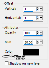 11 - Effects > 3D Effects > Drop Shadow: 1, 1, 100, 50 > Color #000000.