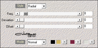3 - Effects > Plugins > Mehdi > Wavy Lab 1.1. Sequência das cores: Cor 5 # 000000 > Cor Foreground #d6ba65 > Cor Background #7d2642 > Cor 4 #ddddd7