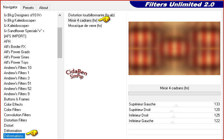 4 - Effects > Plugins > Filters Unlimited 2.0 > Déformations > Miroir4 cadrans(hr).