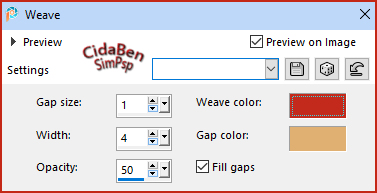 18 - Effects > Texture Effects > Weave. Wave color: Foreground (#c42716). Gap color: Background (#dfb173).