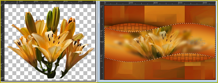 4 - Layers > New Raster Layer. Selections > Select All. Edit > Copy no tube de flores. Edit > paste Into Selection. Selections > Select None.
