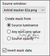 8- Layers > New Raster Layer Color with the foreground color. Layers > New Mask Layer > From image: Astrid masker 62a: