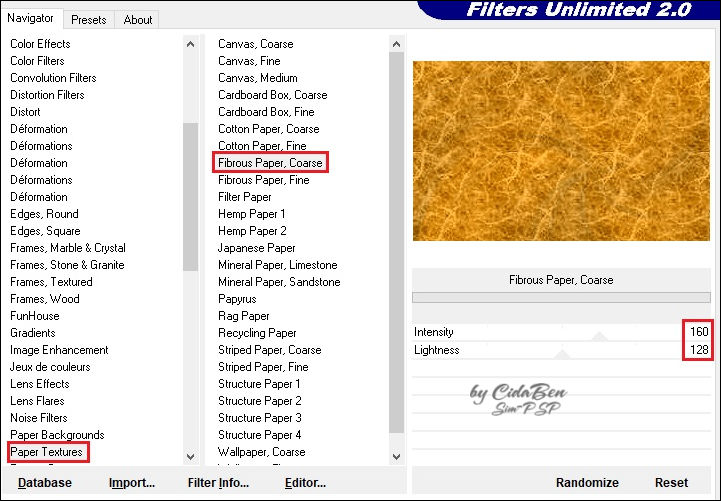 6 - Effects > Plugins > Filters Unlimited 2.0 > Paper Texture > Fibrous Paper, Coarse