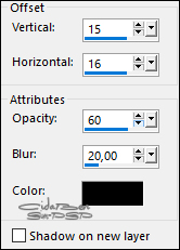 Adjust > Sharpness > Sharpen Effects > 3 DEffects > Drop Shadow: 15, 16, 60, 20, Color: #000000.
